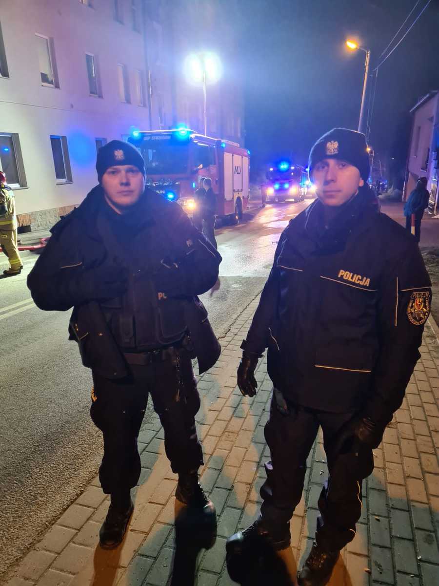 St. sierż. Piotr Wroński oraz sierż. Patryk Dolecki z Komisariatu Policji w Strzegomiu wykazali się bohaterską odwagą. Pomimo szybko rozprzestrzeniającego się ognia oraz dużego zadymienia wyciągnęli z płonącego mieszkania mężczyznę, ugasili na nim odzież i przekazali pod opiekę medyków.
