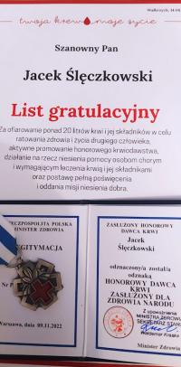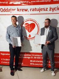 Resortowe odznaczenia Ministra Zdrowia za oddanie 20 litrów krwi lub jej składników otrzymał Tomasz Kosiewicz ze Strzegomia oraz Jacek Ślęczkowski z Goczałkowa.
