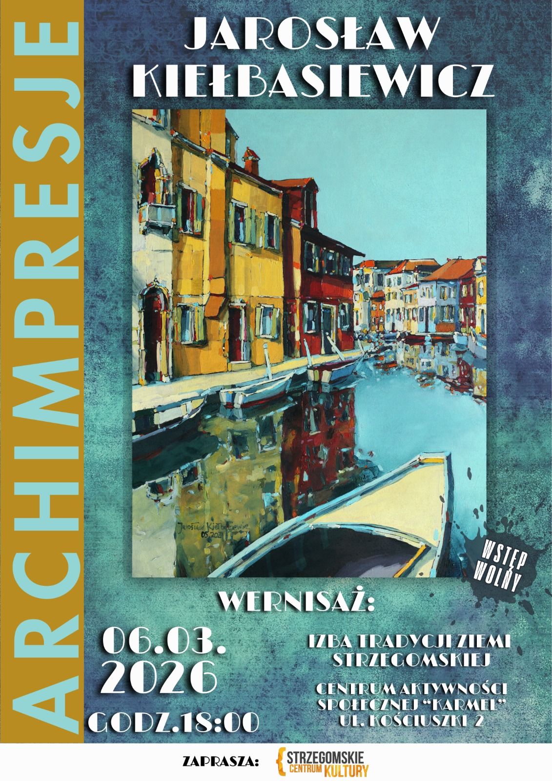„Archimpresje” to cykl malarski Jarosława Kiełbasiewicza, w którym centralne miejsce zajmuje architektura. Artysta przedstawia katedry, ratusze, kamienice, pałace i zamki w charakterystyczny dla siebie sposób – nadając monumentalnym, często chłodnym formom nową, cieplejszą perspektywę i emocjonalny wymiar. Wystawa zostanie zaprezentowana w Centrum Aktywności Społecznej Karmel w Strzegomiu.