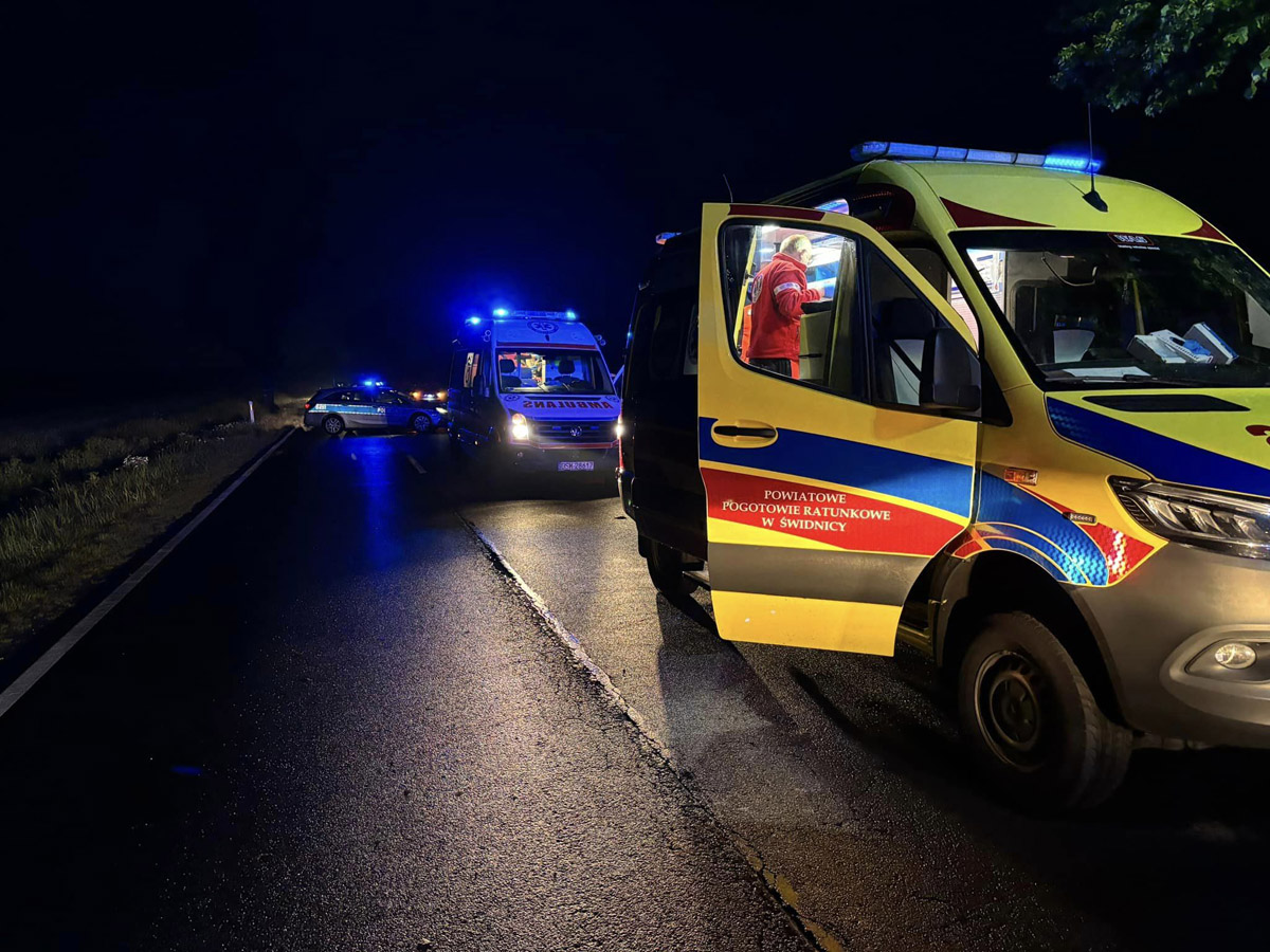 Mł. bryg. Łukasz Grzelak z Komendy Powiatowej Państwowej Straży Pożarnej informuje, że służby otrzymały zgłoszenie o wypadku o godzinie 21.14. - Samochodem podróżowały dwie osoby. Obie przed naszym przyjazdem znajdowały się poza samochodem. Jedna z nich była nieprzytomna i ją zabrali medycy z Lotniczego Pogotowia Ratunkowego. Druga została przewieziona karetką do szpitala – relacjonuje zastępca komendanta ze świdnickiej straży pożarnej.