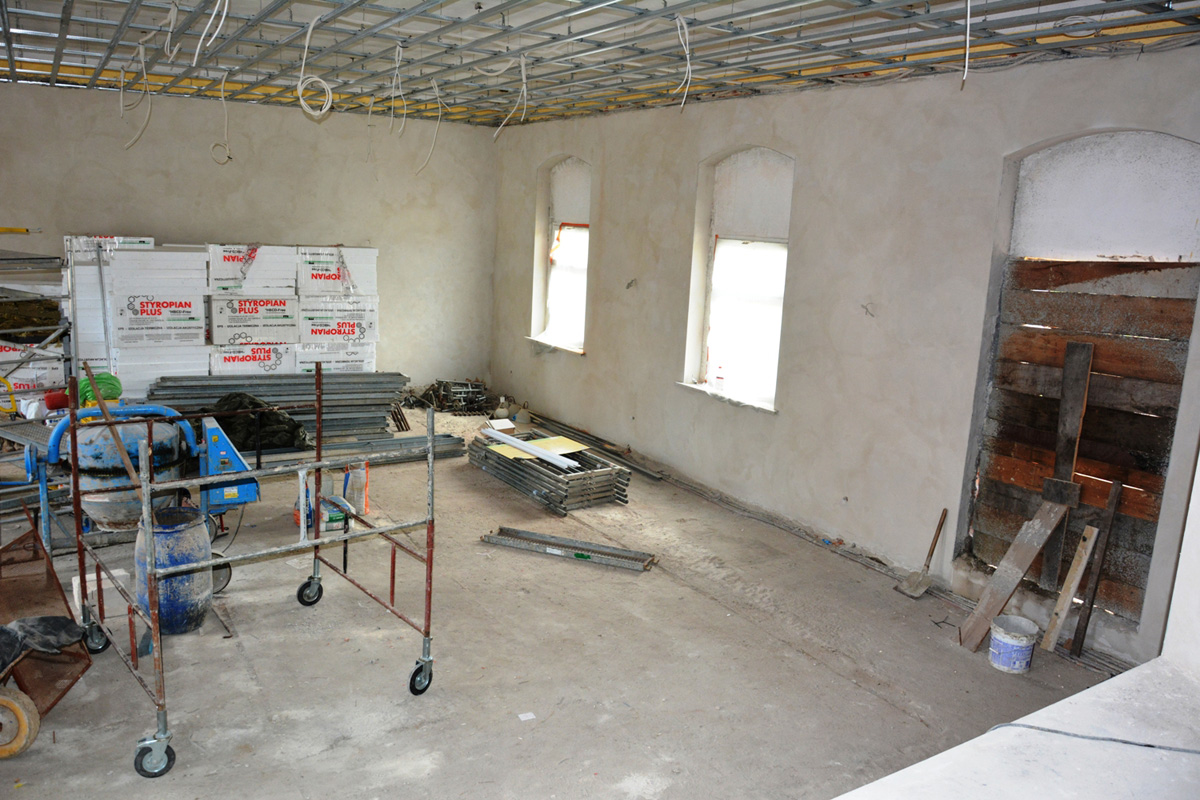 Obecnie trwają prace elewacyjne na zewnątrz oraz dalsze prace remontowe pozostałych pomieszczeń - małej sali, kuchni oraz sanitariatów. Finisz inwestycji zaplanowanona koniec br. roku.