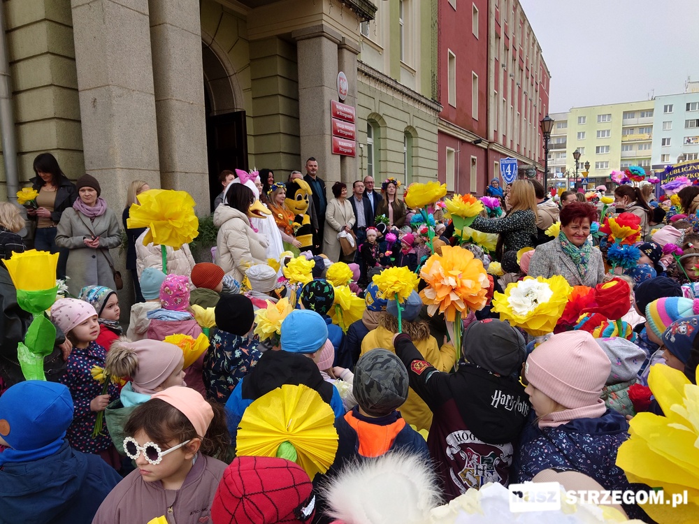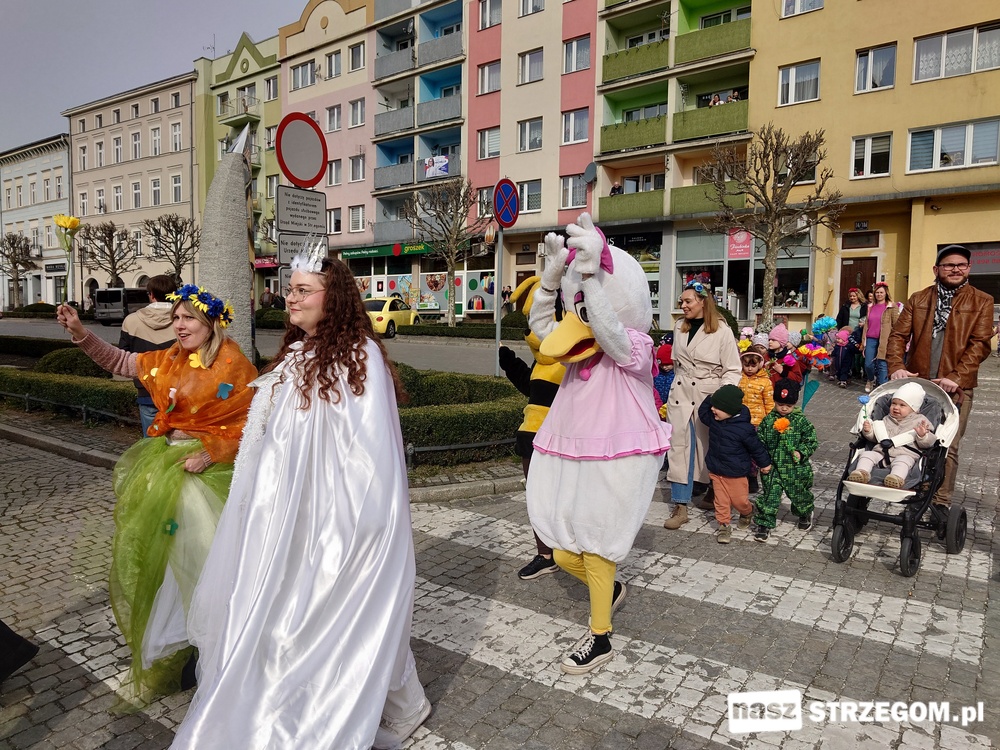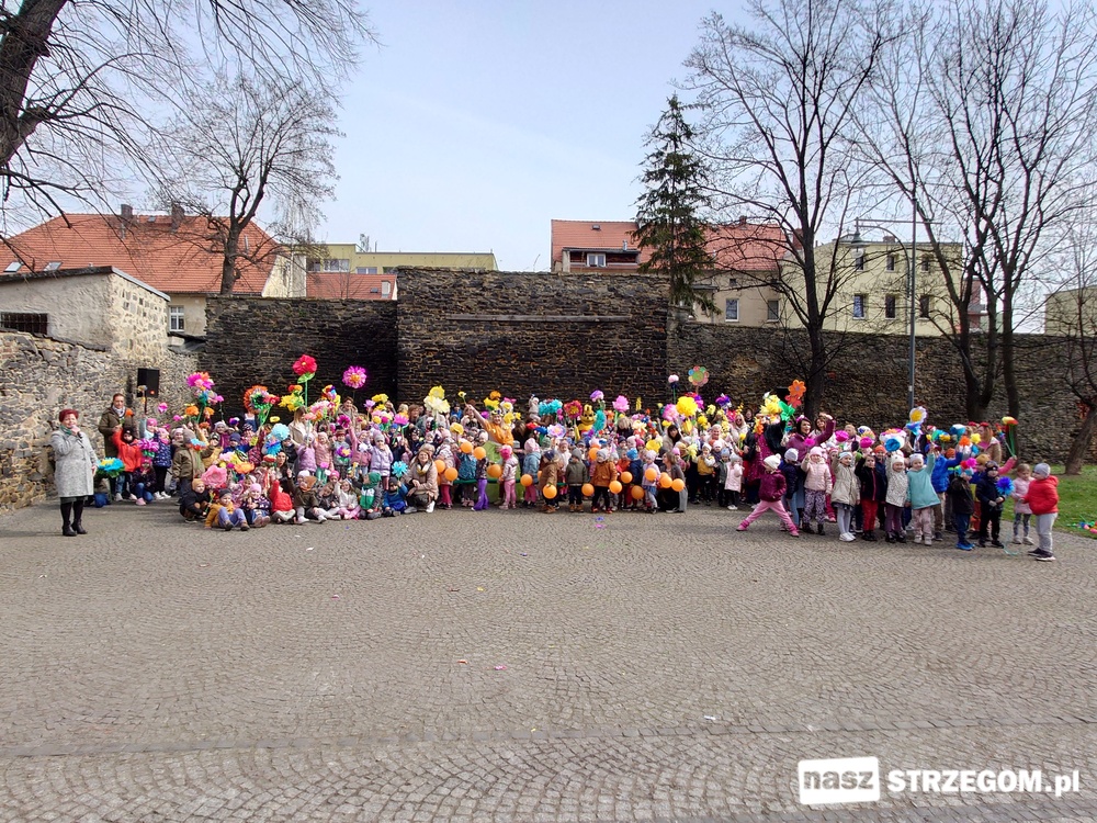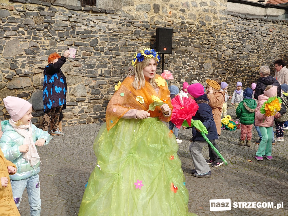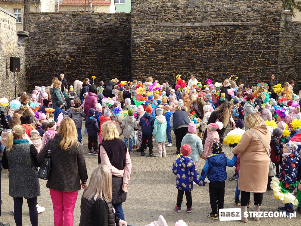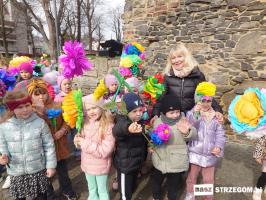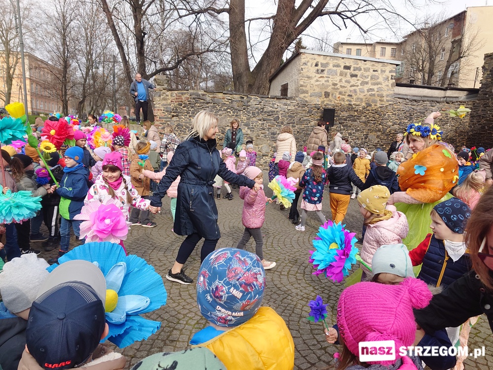 Kolorowe, dziecięce korowody pomaszerowały z przedszkoli pod ratusz, gdzie włodarze częstowali słodkościami. Następnie pochód udał się na strzegomskie planty. Tam w tanecznym rytmie nastąpiło oficjalne przywitanie wiosny.