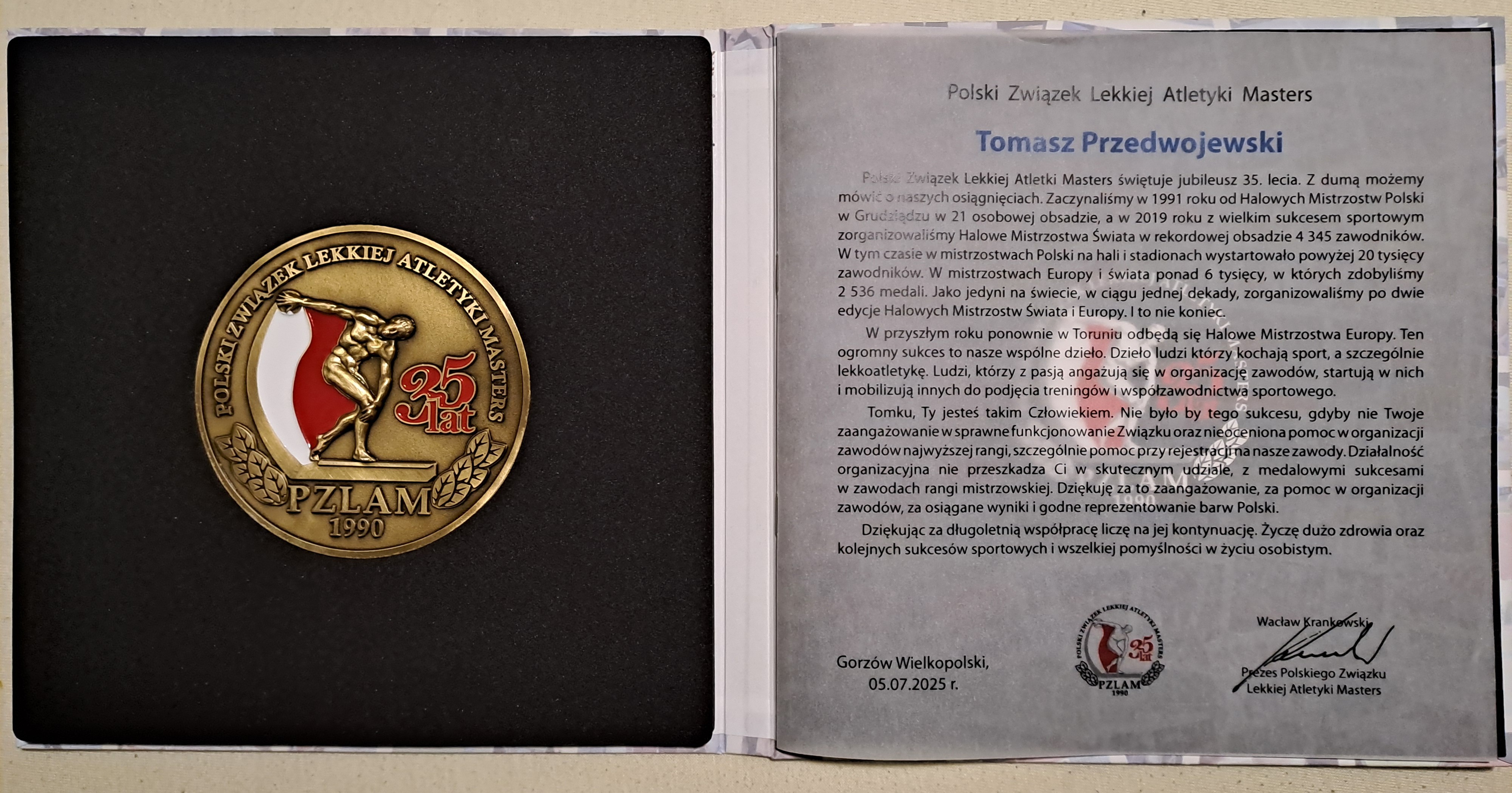 W sobotę miała miejsce uroczysta gala z okazji 35-lecia Polskiego Związku Lekkiej Atletyki Masters. - Podczas gali wręczono okolicznościowe medale wyrażające podziękowanie za zaangażowanie, pomoc w organizacji zawodów, osiągane wyniki i godne reprezentowanie barw Polski. W gronie uhonorowanych osób znalazł się również Tomasz – podkreśla Edward Fedyczkowski.