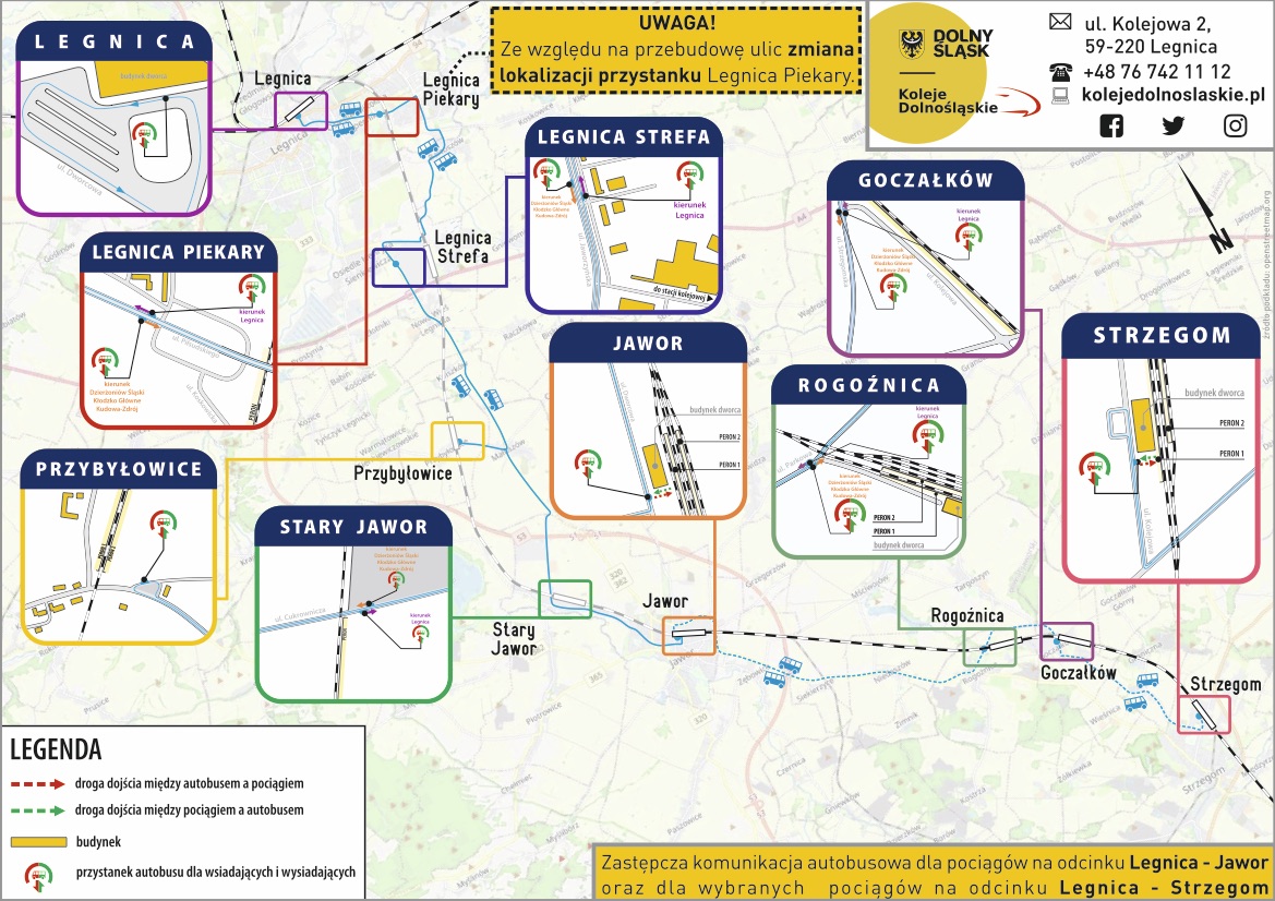 Według komunikatu dolnośląskiego przewoźnika, utrudnienia potrwają do 15 maja br. - Ze względu na przebudowę ulic zmieniono lokalizację przystanku komunikacji zastępczej Legnica Piekary - informują Koleje Dolnośląskie i proszę pasażerów o zapoznanie się ze schematem kursowania komunikacji zastępczej i rozkładem jazdy przed rozpoczęciem podróży.