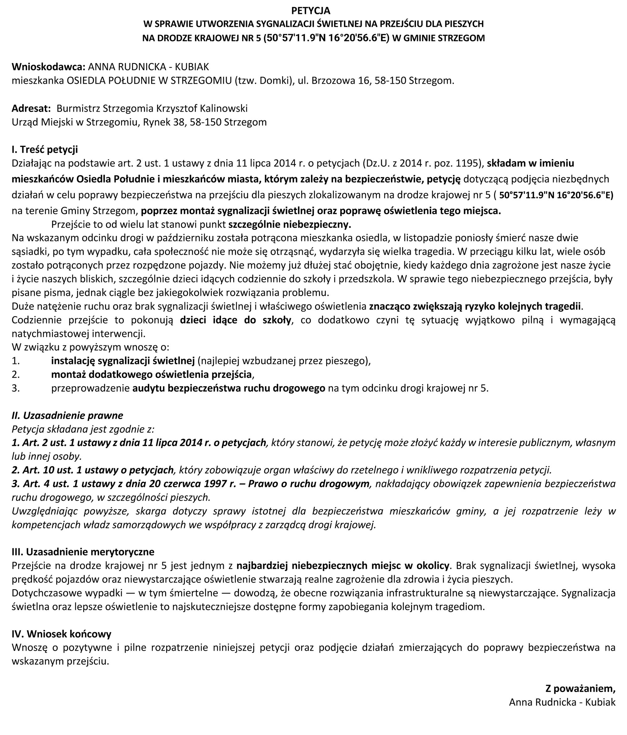 Krzysztof Kalinowski deklaruje, że kilka dni później, 19 listopada, rozmawiał także z wicedyrektorem ds. zarządzania drogami i mostami w GDDKiA. - Jacek Mozalewski przekazał informację, że jest przygotowany projekt doświetlenia odcinka drogi — od feralnego przejścia do ronda. Ta inwestycja nie była ujęta w budżecie na przyszły rok, ale GDDKiA zadeklarowała zabezpieczenie środków na ten cel. Ostateczną odpowiedź w tej sprawie będziemy mieć w środę, 28 listopada. Padła też zapowiedź osobistej inspekcji przez przedstawiciela GDDKiA przejść w Strzegomiu i Jaroszowie oraz oceny braku chodnika w Modlęcinie – podkreśla burmistrz Strzegomia.