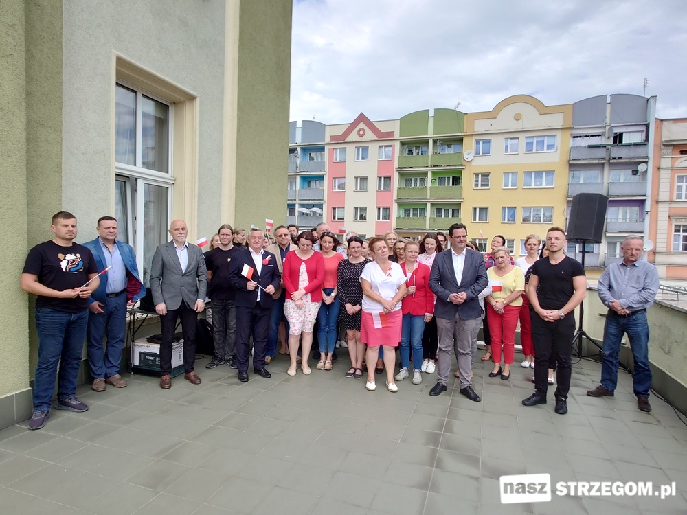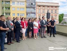 W symbolicznej uroczystości na tarasie UM w Strzegomiu wzięli udział samorządowcy oraz pracownicy magistratu.