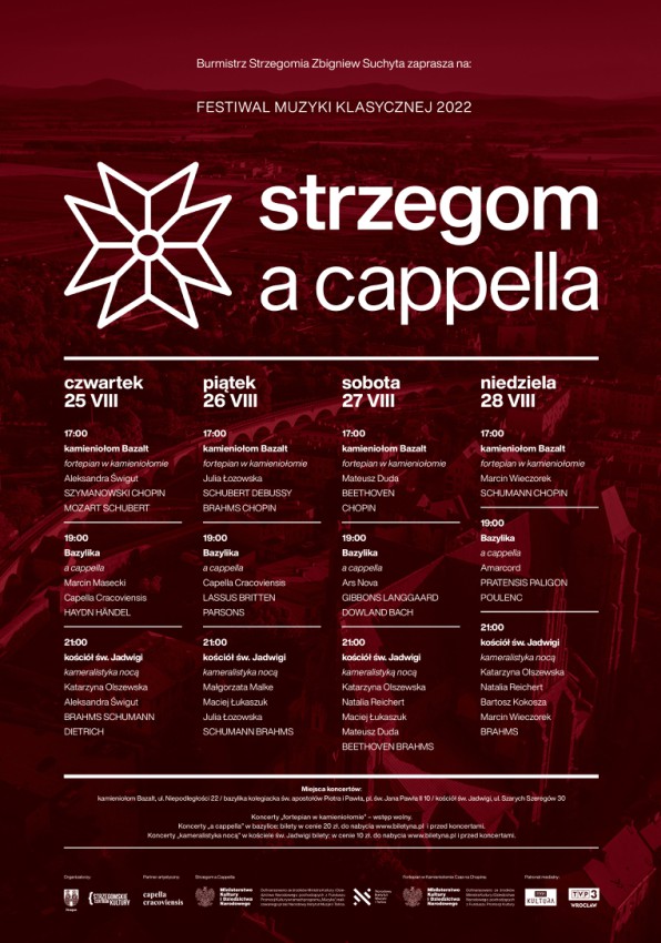 25 sierpnia rozpocznie się trzecia edycja festiwalu Strzegom A Cappella z udziałem polskich i zagranicznych artystów. Publiczność i melomani mogą liczyć na arcydzieła muzyki klasycznej w najlepszym wykonaniu, w tym Capelli Cracoviensis. Koncerty zaplanowano w strzegomskiej Bazylice Mniejszej, kościele św. Jadwigi, ale także w plenerze - kamieniołomie Bazalt.