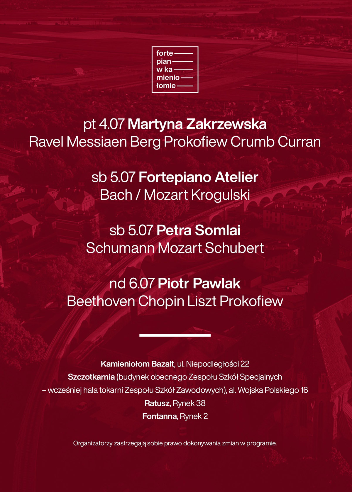 W tym roku koncerty zaplanowano m.in. w kamieniołomie Bazalt, na strzegomskim Rynku, w Urzędzie Miejskim oraz w tzw. „szczotkarni” – budynku obecnego Zespołu Szkół Specjalnych.