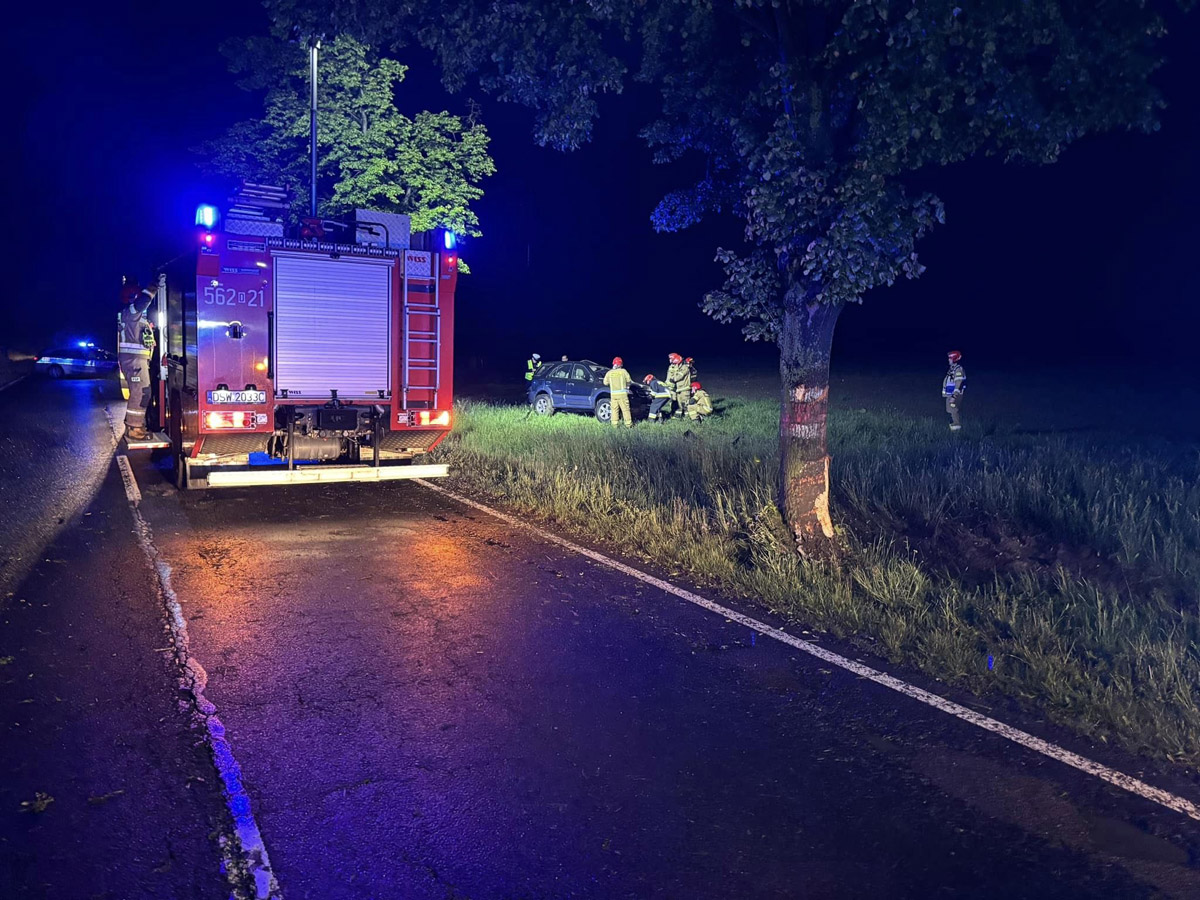 Mł. bryg. Łukasz Grzelak z Komendy Powiatowej Państwowej Straży Pożarnej informuje, że służby otrzymały zgłoszenie o wypadku o godzinie 21.14. - Samochodem podróżowały dwie osoby. Obie przed naszym przyjazdem znajdowały się poza samochodem. Jedna z nich była nieprzytomna i ją zabrali medycy z Lotniczego Pogotowia Ratunkowego. Druga została przewieziona karetką do szpitala – relacjonuje zastępca komendanta ze świdnickiej straży pożarnej.