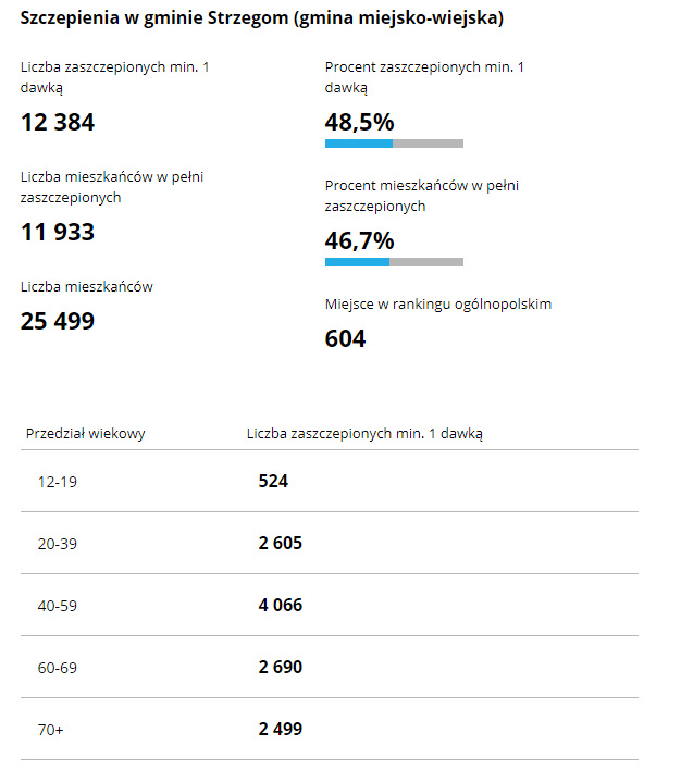 Zaszczepionych minimum 1 dawką szczepionki zostało 12384 mieszkańców gminy Strzegom, w tym 4066 osób w wieku 40-59 lat, 2690 mieszkańców w wieku 60-69 lat, 2605 osób w wieku 20-39 lat oraz 2499 seniorów w grupie wiekowej 70+. Wśród zaszczepionych 1 dawką są również dzieci i młodzież w liczbie 524 osób.