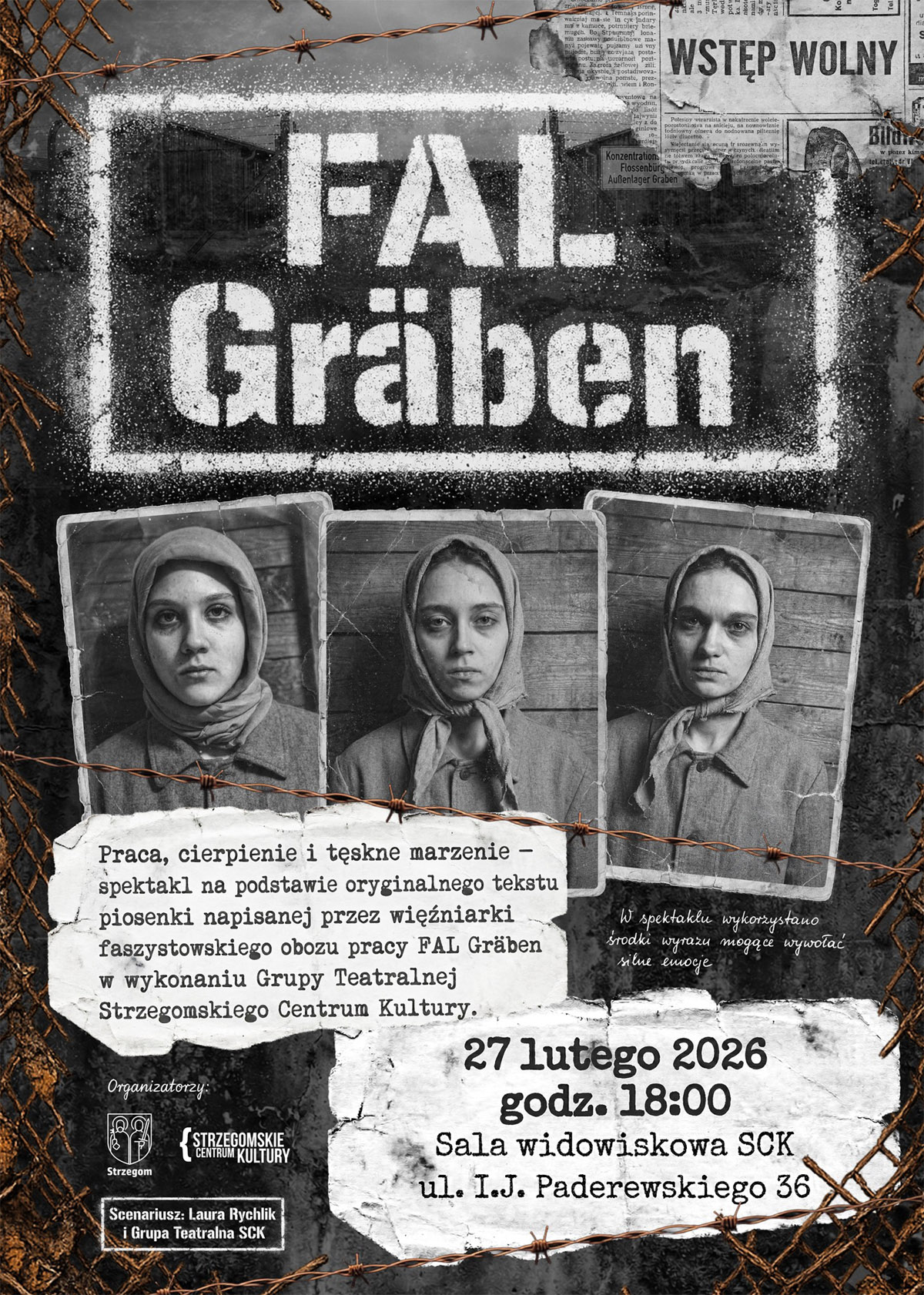 Grupa teatralna Strzegomskiego Centrum Kultury przygotowuje spektakl oparty na unikalnym świadectwie więźniarek niemieckiego obozu pracy FAL Graben. Autorką scenariusza jest Laura Rychlik. Jak podkreśla współtwórca przedstawienia, Ireneusz Miepariszwili, projekt czerpie z autentycznych emocji i słów piosenki napisanej przez jedną z więźniarek – to właśnie jej „praca, cierpienie i tęskne marzenia”, utrwalone w obozowej pieśni, stały się kanwą przedstawienia.