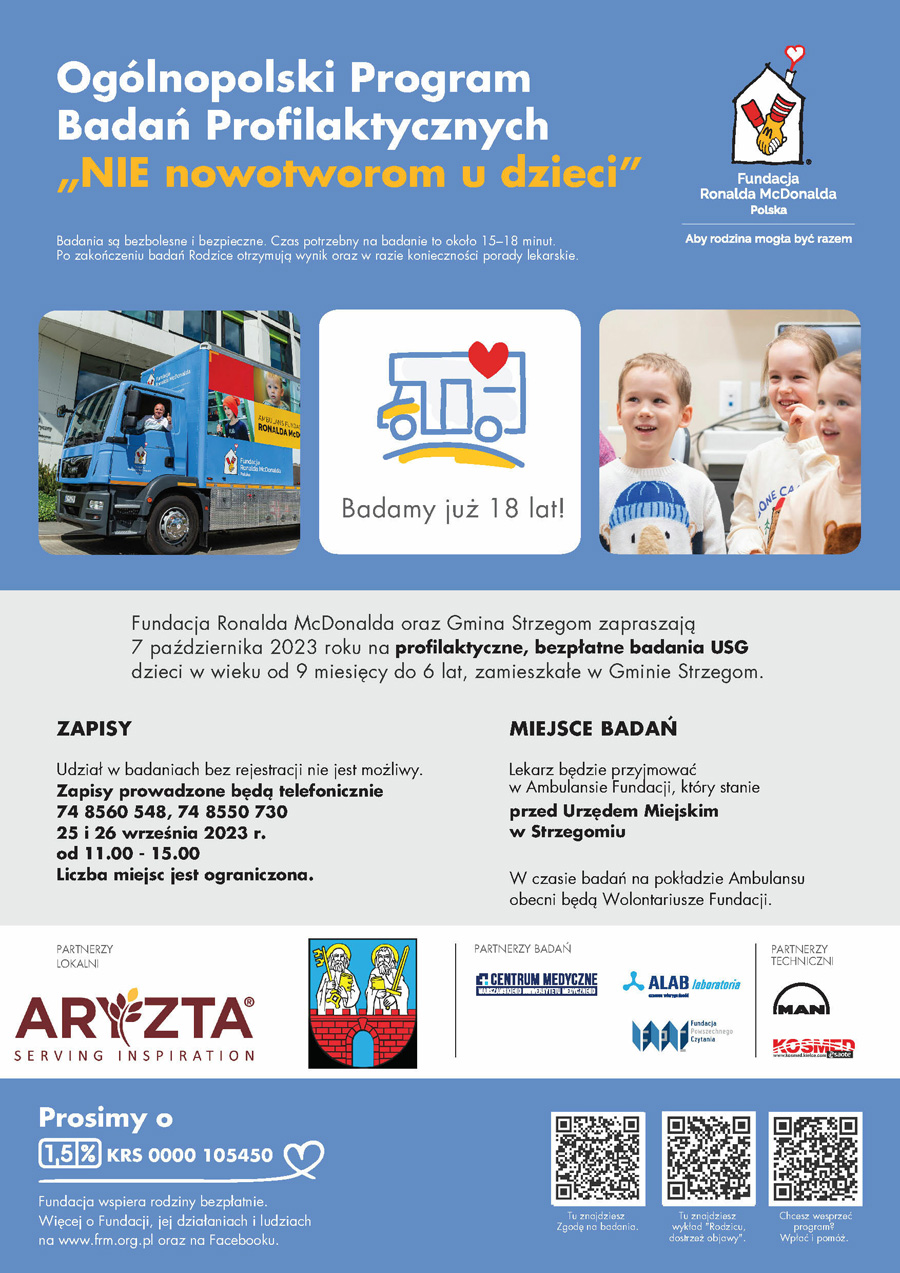 Z badań mogą skorzystać dzieci z gminy Strzegom w wieku od 9 miesiąca do 6 roku życia. Należy je poprzedzić wcześniejszą rejestracją, która będzie możliwa w dniach 25-26 września w godzinach od 11.00 do 15.00 pod numerami telefonów: 74 8560 548 oraz 74 8550 730. Liczba miejsc jest ograniczona.