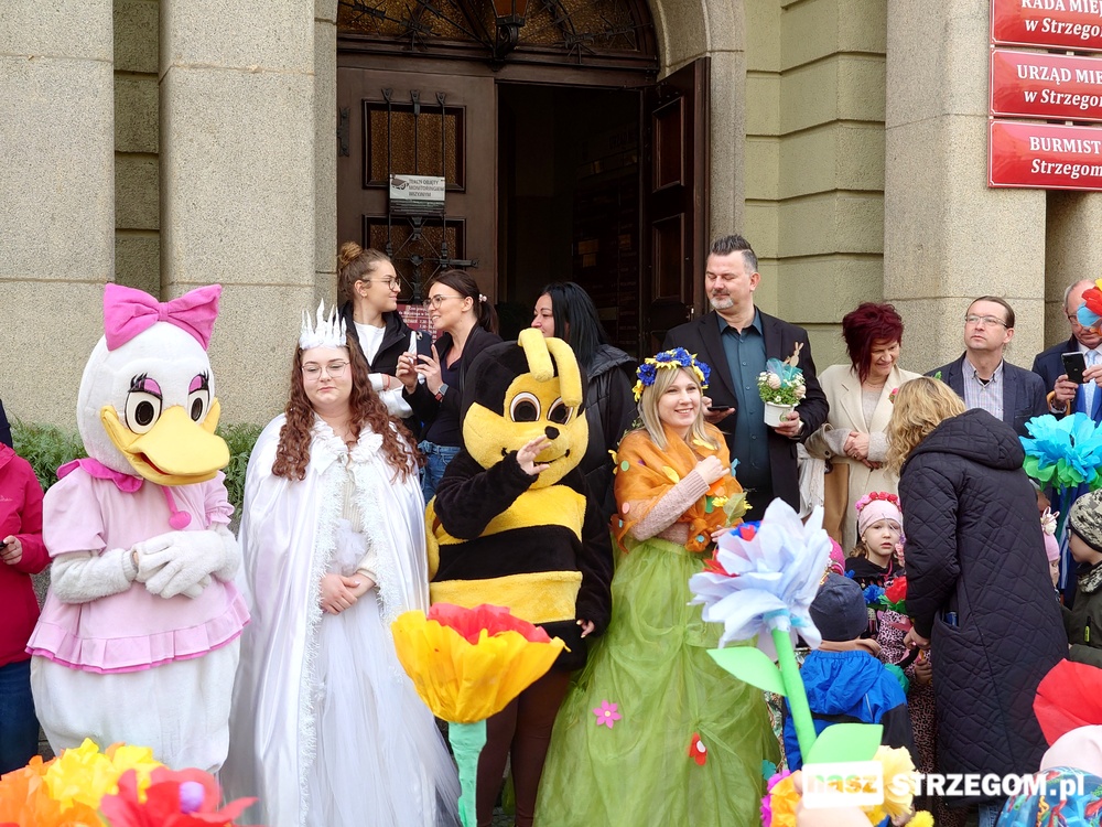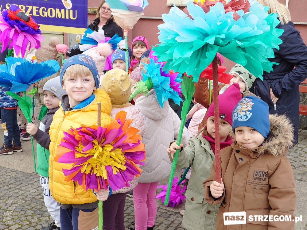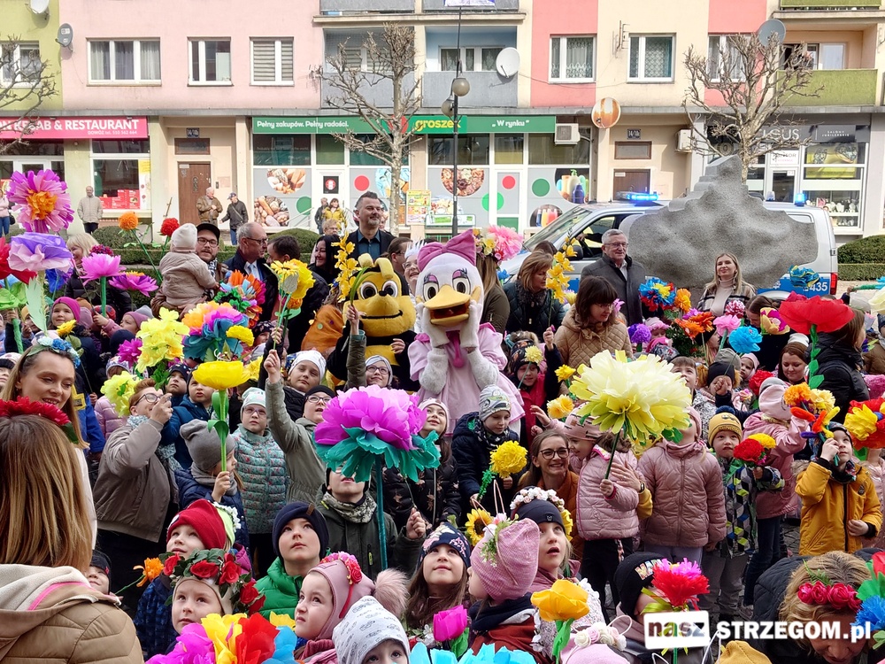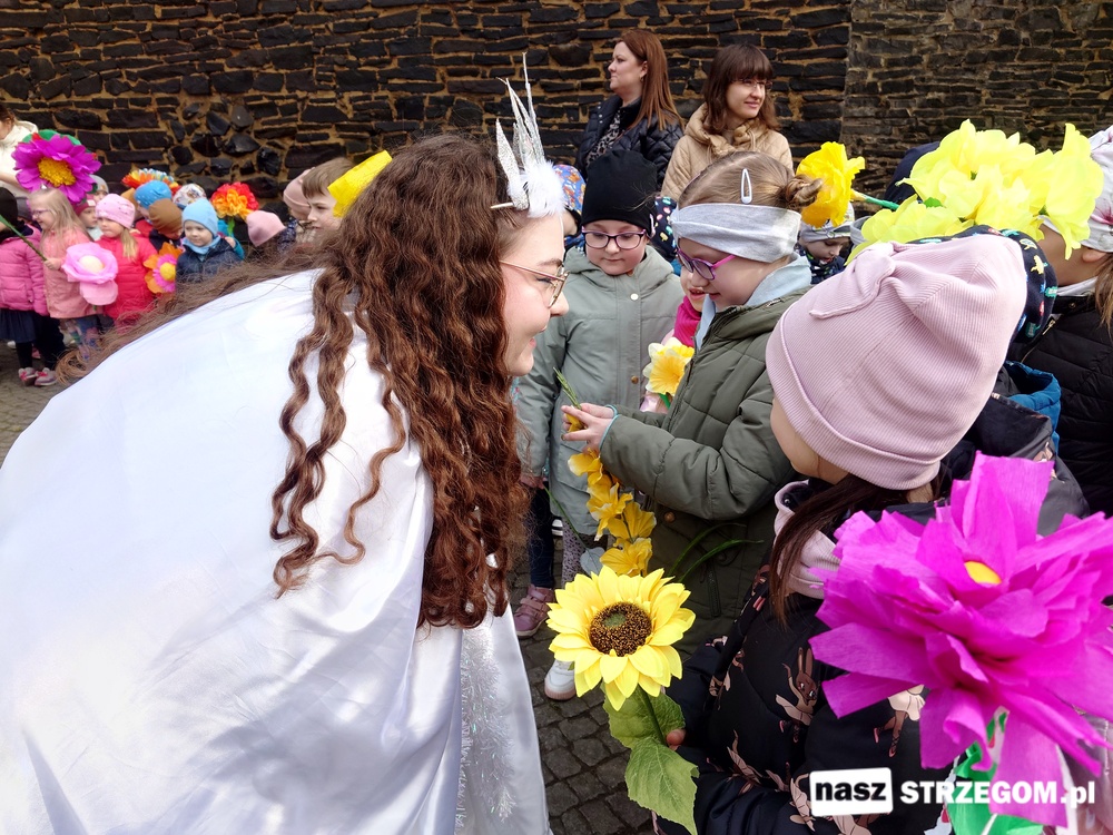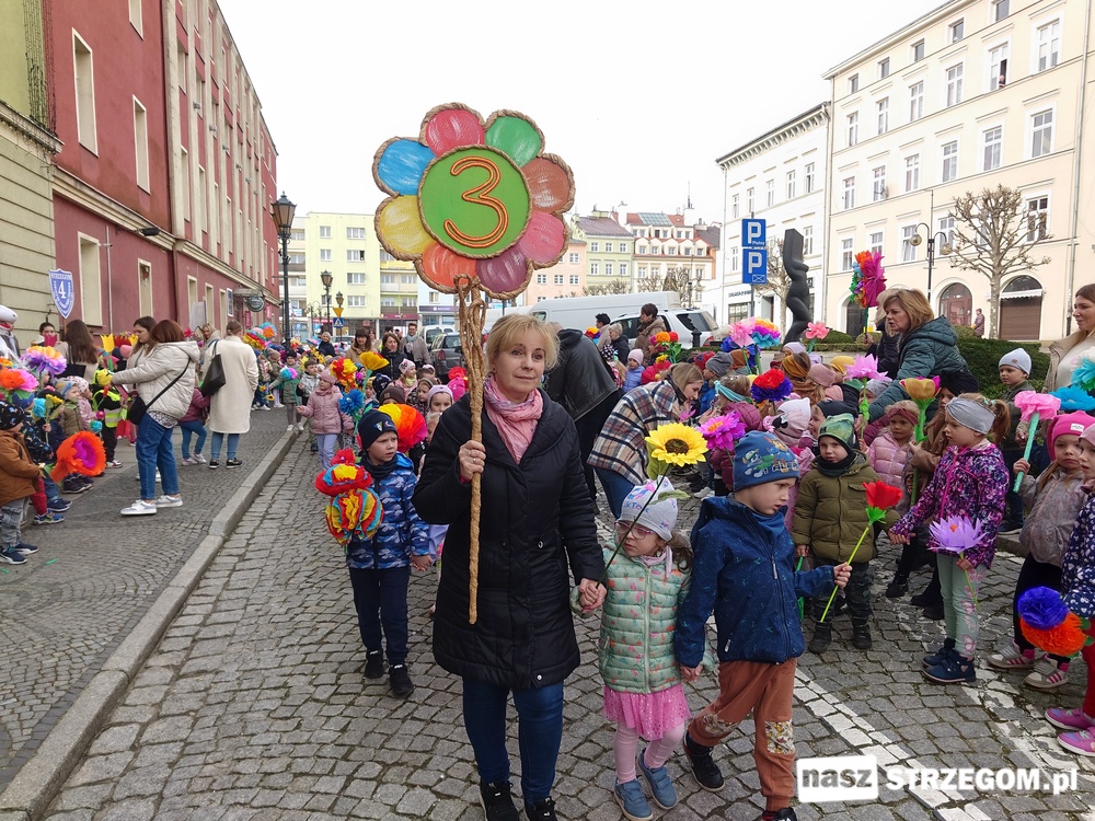 Kolorowe, dziecięce korowody pomaszerowały z przedszkoli pod ratusz, gdzie włodarze częstowali słodkościami. Następnie pochód udał się na strzegomskie planty. Tam w tanecznym rytmie nastąpiło oficjalne przywitanie wiosny.