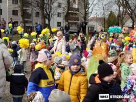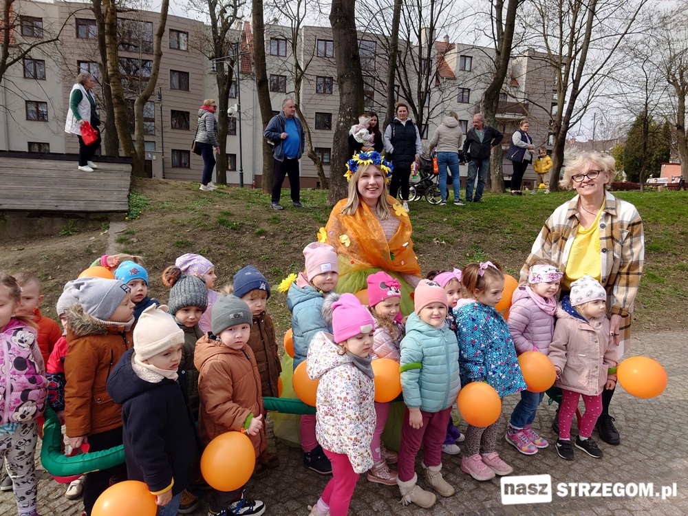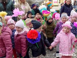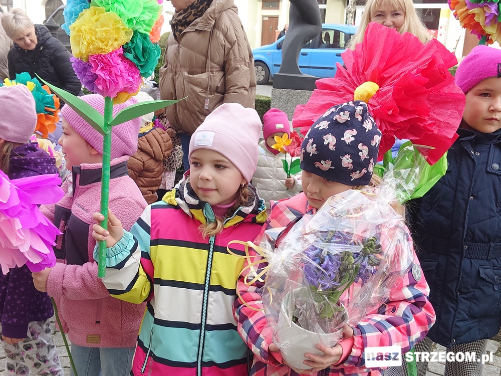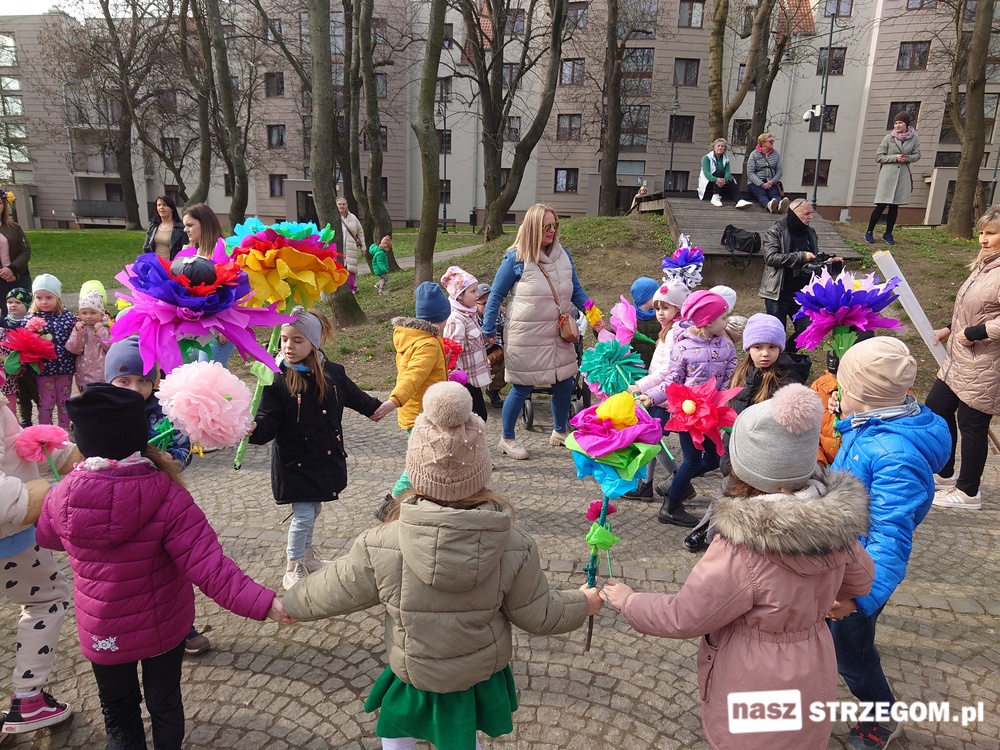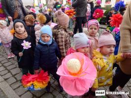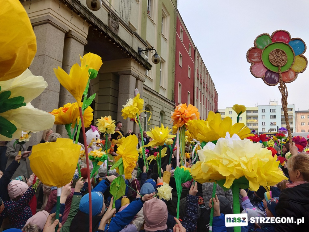 Kolorowe, dziecięce korowody pomaszerowały z przedszkoli pod ratusz, gdzie włodarze częstowali słodkościami. Następnie pochód udał się na strzegomskie planty. Tam w tanecznym rytmie nastąpiło oficjalne przywitanie wiosny.