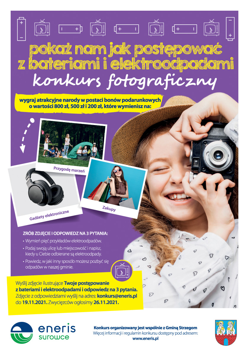 Udział w konkursie pt. „Baterie i Elektroodpady” jest bardzo prosty i polega na zrobieniu zdjęcia, promującego dobre nawyki w zakresie radzenia sobie z takimi odpadami, jak baterie, akumulatory czy zużyty sprzęt RTV i AGD. Ponadto należy odpowiedzieć na trzy pytania i całość przesłać na adres konkurs@eneris.pl do 19 listopada br.