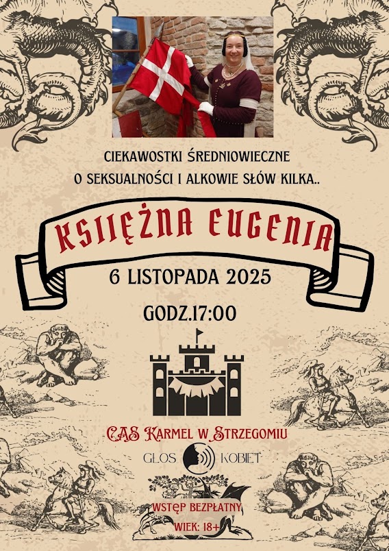 Tajemnicza Księżna Eugenia po raz kolejny zawita do Strzegomia, by przenieść słuchaczy w barwny świat średniowiecza. W czwartek 6 listopada, spotka się z mieszkańcami w Centrum Aktywności Społecznej Karmel i rozwieje mity dotyczące ówczesnej seksualności i życia w alkowie.