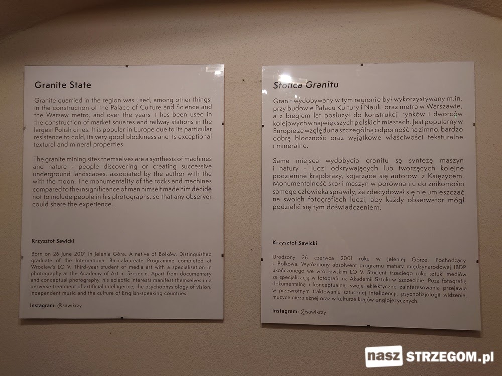 Krzysztof Sawicki pochodzi z Bolkowa. Obecnie mieszka w Szczecinie, gdzie studiuje sztukę mediów. Artysta mówi, że inspiracją do wykonania zdjęć były monumentalne, szare ściany granitu widziane podczas podróży w okolicach Strzegomia. - Postanowiłem udokumentować nie tylko sam granit, ale również formy jego wydobycia, dlatego oprócz fotografii znajdują się tutaj też autorskie opisy poruszające temat eksploatacji, a także rekultywacji nieczynnych wyrobisk – opowiada autor. Twórca zaznacza, że nie bez powodu wszystkie prezentowane zdjęcia są w odcieniach stonowanej szarości.