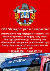 Strażacy zbiórkę złomu ogłosili już po raz drugi, zachęceni powodzeniem pierwszej akcji. Proszą o typowy złom, nie odbierają elektroodpadów takich jak pralki czy lodówki. Kontakt poprzez podane na plakacie numery telefonów.