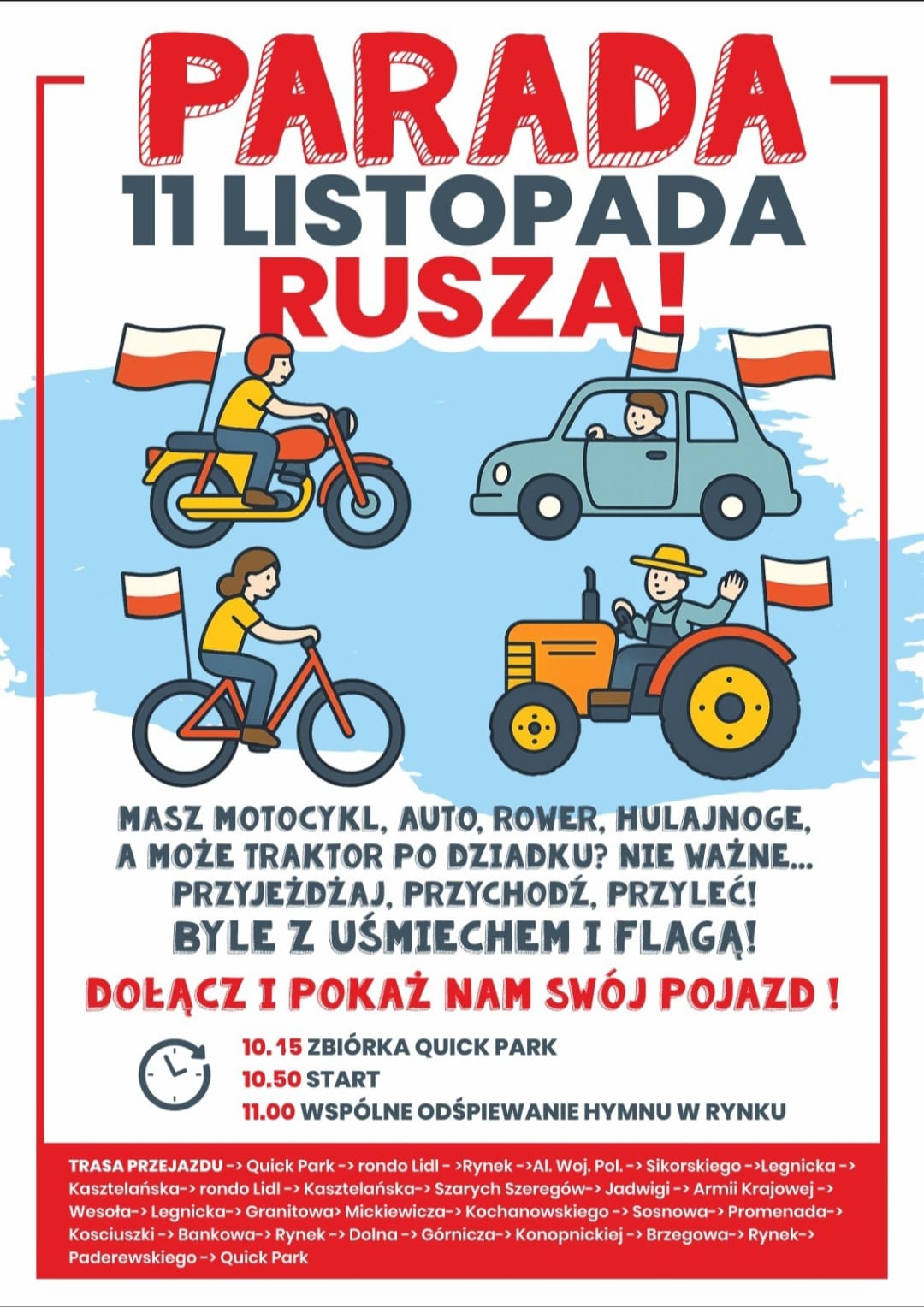– W tym roku spotykamy się o godz. 10:15 na parkingu przy centrum handlowym przy Alei Wojska Polskiego w Strzegomiu. Wyjazd zaplanowaliśmy o 10:50. Po godzinie 11:00 odwiedzimy miejski Rynek, gdzie wspólnie odśpiewamy hymn Polski i zrobimy sporo hałasu – podkreśla Olga Czuk.