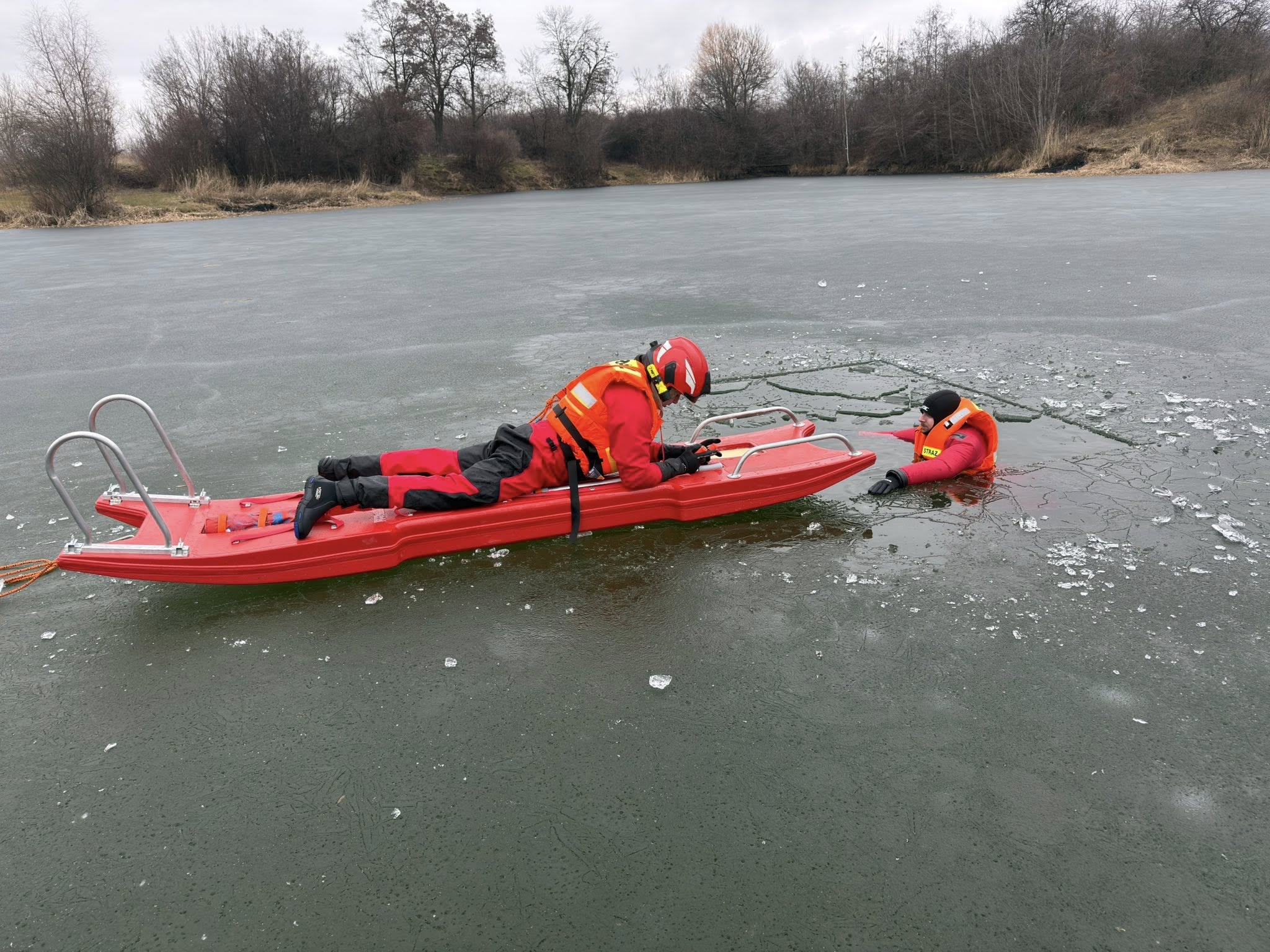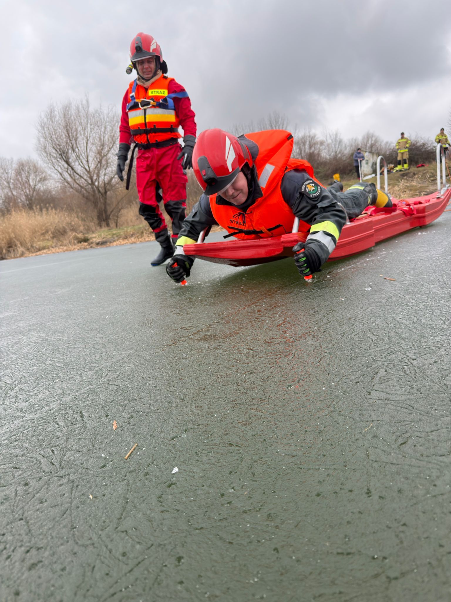 Naczelnik OSP Strzegom Krystian Jaszowski informuje, że strażacy przećwiczyli techniki poruszania się po zamarzniętych akwenach wodnych przy użyciu sań lodowych. - Drugim ważnym aspektem było podjęcie osoby poszkodowanej z wody. Niezmiernie cieszy mnie zaangażowanie druhów oraz profesjonalizm włożony w ćwiczenia aby przy realistycznych działaniach nic nas nie zaskoczyło – dodaje naczelnik Krystian Jaszowski.