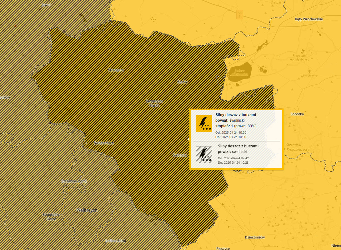 Ostrzeżenie meteorologiczne pierwszego stopnia o intensywnych opadach deszczu w powiecie świdnickim obowiązuje od 24 do 25 kwietnia br. do godziny 10.00.
