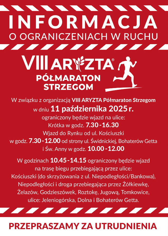 W dniu wydarzenia wystąpią utrudnienia w ruchu drogowym. 11 października w godzinach 7:30–16:30 zamknięta będzie ulica Krótka. Wjazd do Rynku od ul. Kościuszki będzie niemożliwy w godzinach 7:30–12:00, natomiast od ulic Świdnickiej, Bohaterów Getta i św. Anny – w godzinach 10:00–12:00. Dodatkowo, w godzinach 10:45–14:15 obowiązywać będą ograniczenia w ruchu na trasie Biegu prowadzącej przez ulice: Kościuszki, Niepodległości, Jeleniogórską, Dolną i Bohaterów Getta, a także przez miejscowości: Żółkiewka, Żelazów, Godzieszówek, Roztoka, Jugowa i Tomkowice.