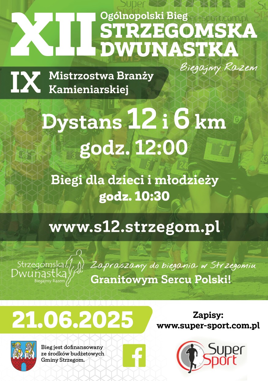 Ruszyły zapisy na 12. edycję biegu Strzegomska Dwunastka – Biegajmy Razem. Rywalizacja odbędzie się 21 czerwca br., podczas Święta Granitu Strzegomskiego. Prezes Stowarzyszenia Strzegomska Dwunasta – Edward Fedyczkowski informuje, że bieg odbędzie się po zeszłorocznej trasie na dystansach 6 i 12 kilometrów.