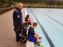 Padający deszcz i zaledwie 10 stopni Celsjusza na zewnątrz nie zniechęciły młodzieży do sobotnich zajęć na odkrytym basenie. Uczniowie klas mundurowych strzegomskiego LO zapoznali się ze sprzętem do nurkowania, a następnie zniknęli pod wodą.