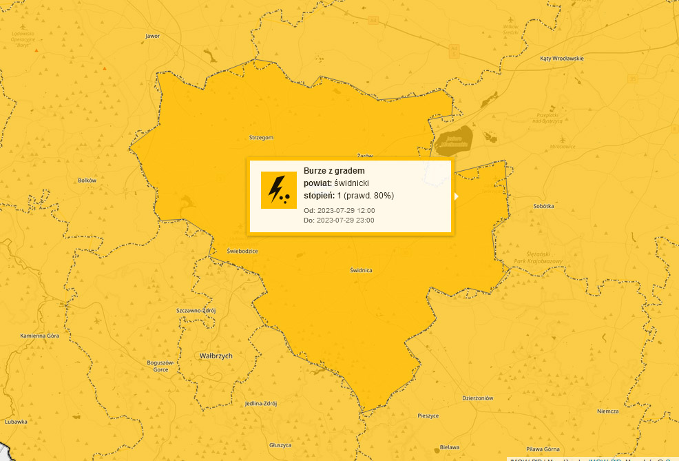 Ostrzeżenie I stopnia dla powiatu świdnickiego obowiązuje w sobotę (29.07.) od godziny 12:00 do godziny 23:00. Prawdopodobieństwo wystąpienia prognozowanych zjawisk oceniono na 80%.