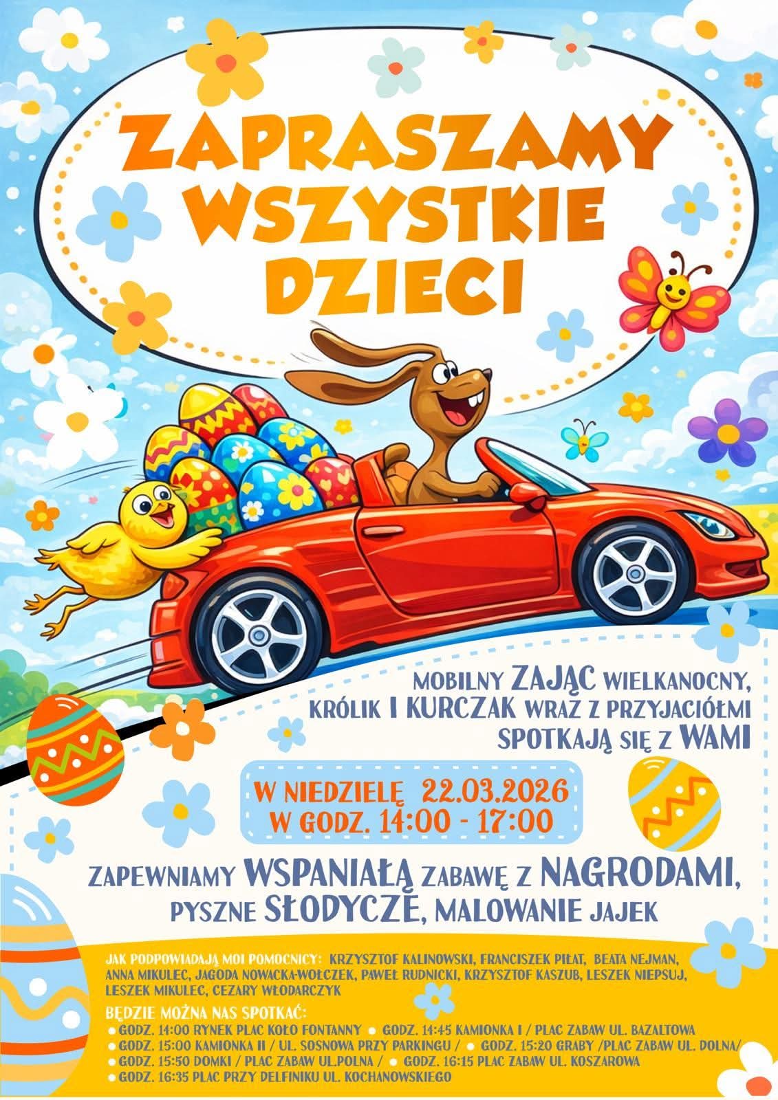 Mobilnemu zającowi wielkanocnemu towarzyszyć będą jego pomocnicy: Krzysztof Kalinowski, Franciszek Piłat, Beata Nejman, Anna Mikulec, Jagoda Nowacka-Wołczek, Paweł Rudnicki, Krzysztof Kaszub, Leszek Niepsuj, Leszek Mikulec i Cezary Włodarczyk.