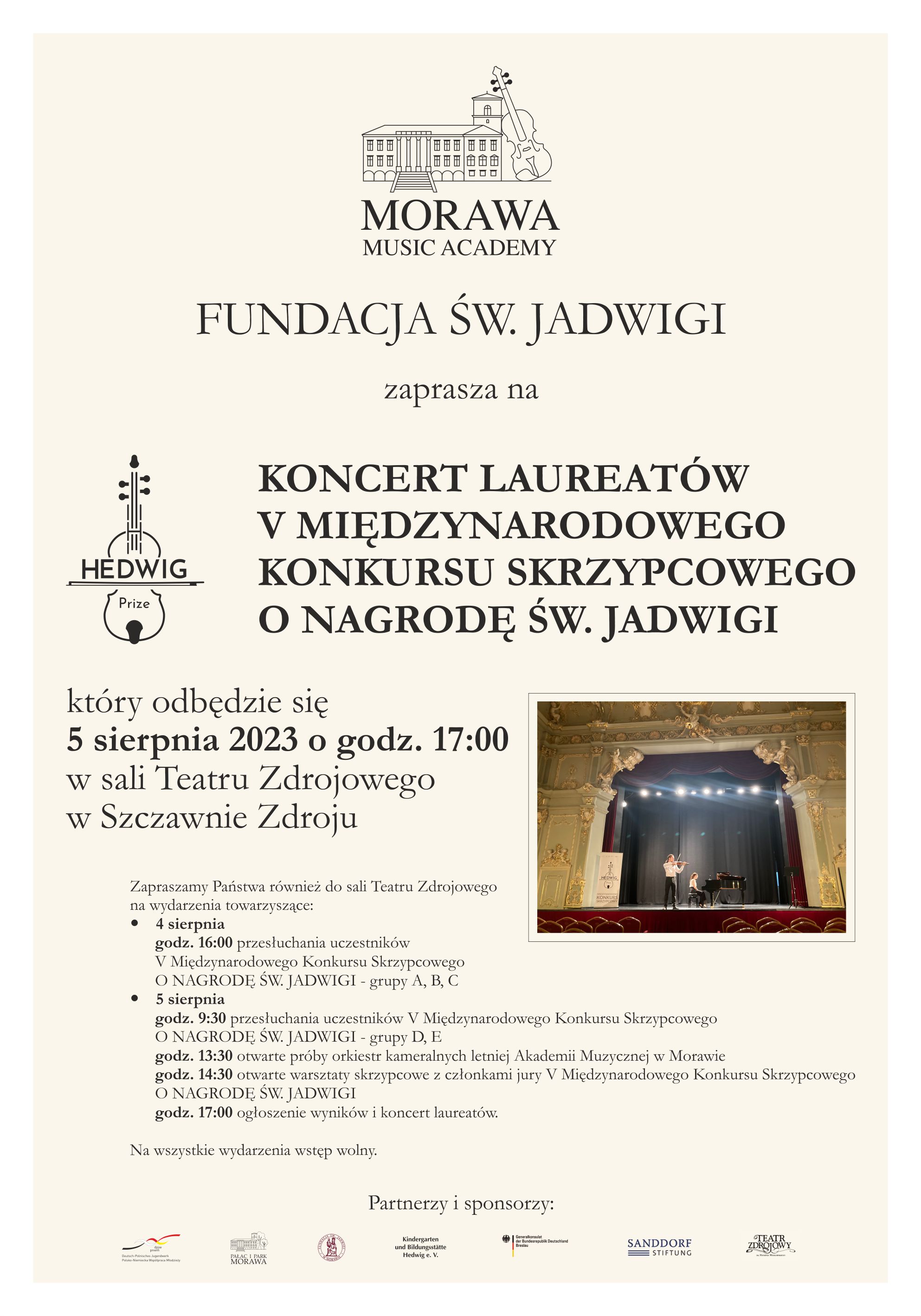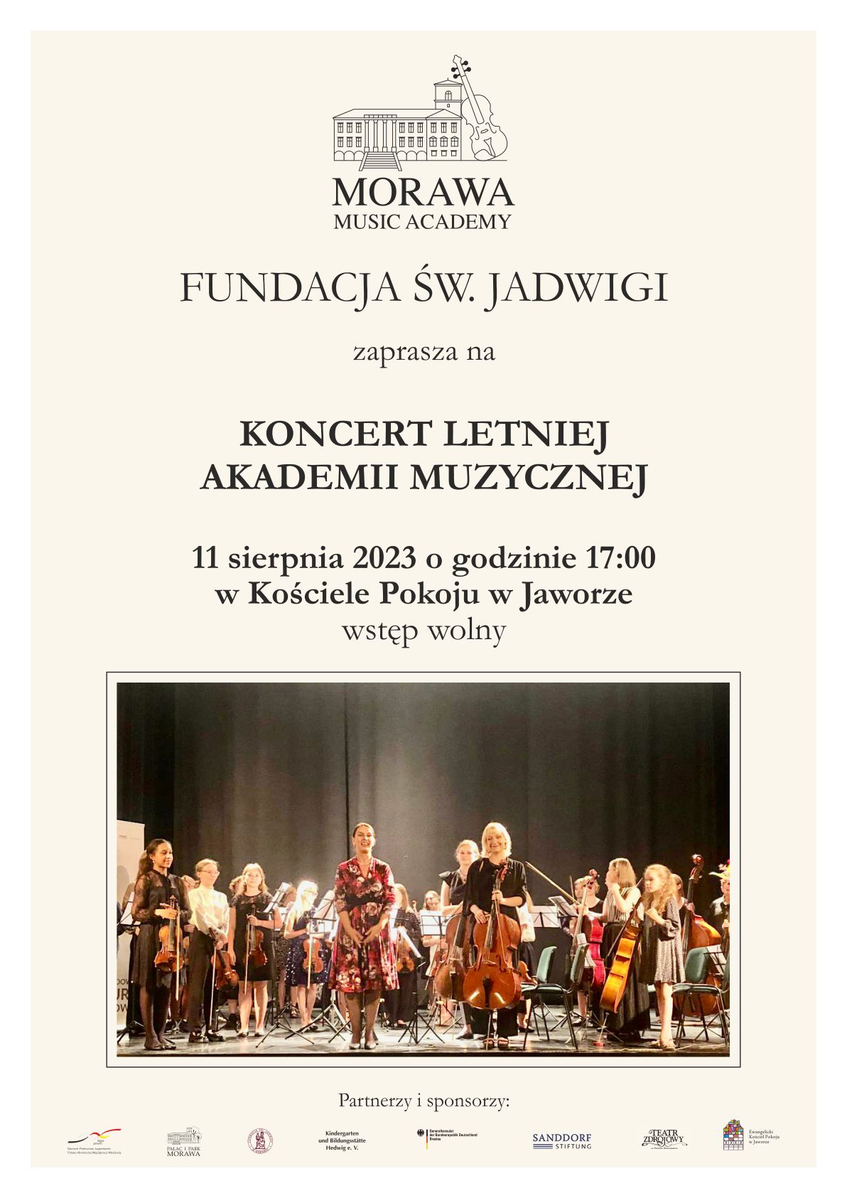 Podczas tegorocznej edycji akademii zaplanowane są 3 koncerty. 5 sierpnia o godzinie 17.00 w sali Teatru Zdrojowego w Szczawnie Zdroju odbędzie się występ laureatów Międzynarodowego Konkursu Skrzypcowego o Nagrodę św. Jadwigi. Kolejne wydarzenie - 11 sierpnia o 17.00 w Kościele Pokoju w Jaworze. Wstęp jest nieodpłatny. - Koncert finałowy rozbrzmi w Morawie 12 sierpnia, ale nie ma już wolnych miejsc. – dodaje dyrektorka.