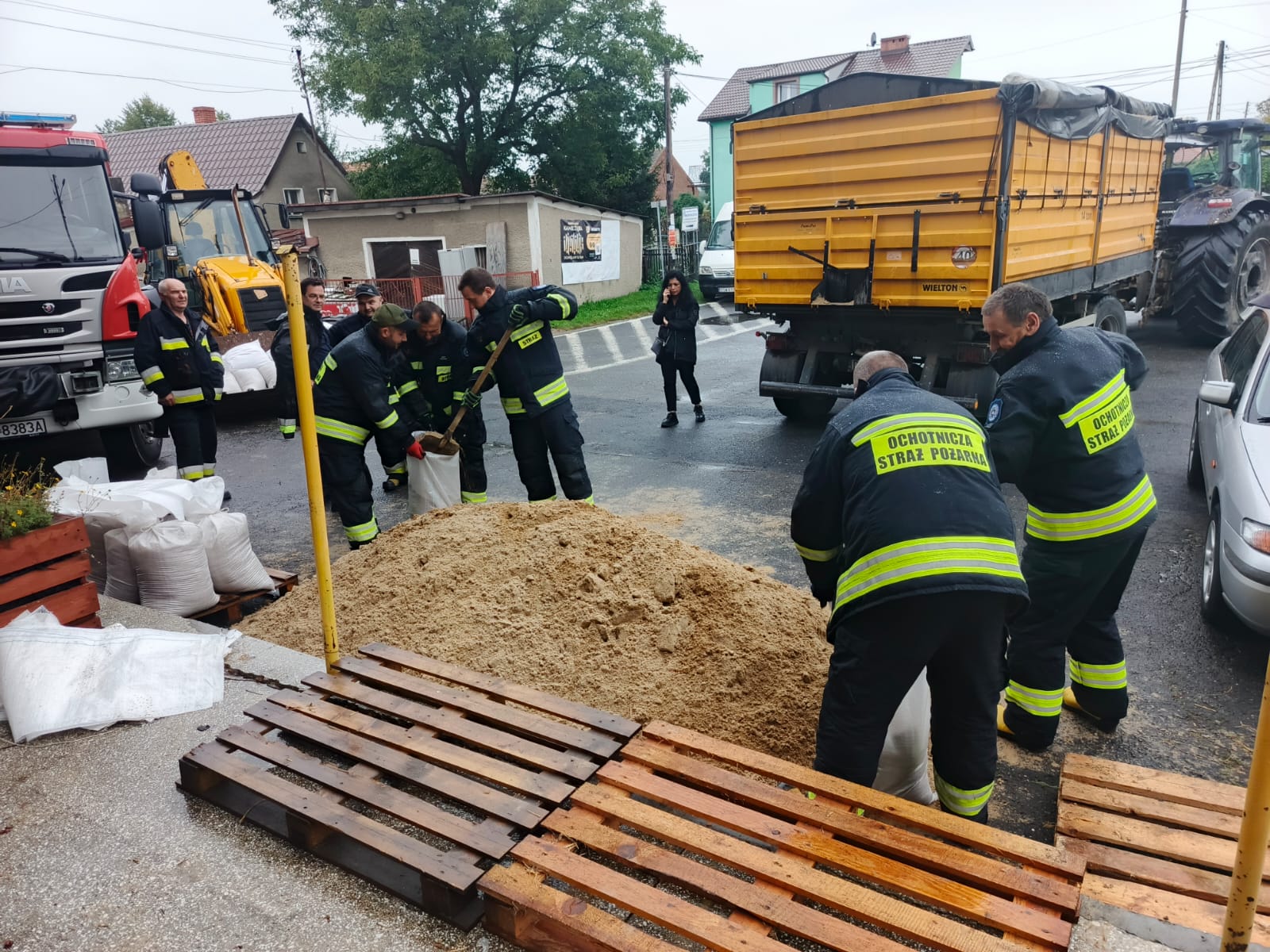 - Przygotowaliśmy blisko 200 worków z piaskiem, które w każdej chwili będziemy mogli wykorzystać, jeżeli zajdzie taka potrzeba. W akcje, oprócz naszych druhów, włączyli się mieszkańcy, a także Joanna Berestecka z Gminnego Zespołu Zarządzania Kryzysowego. Worki z piaskiem ładował także burmistrz Strzegomia – Krzysztof Kalinowski – mówi Mateusz Najwer z OSP Olszany.