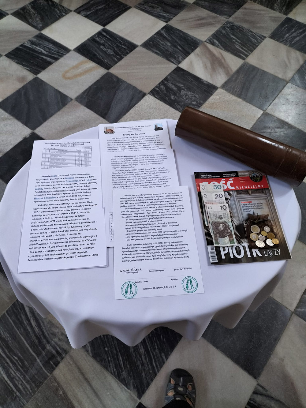 Na początku lipca informowaliśmy o odkryciu podczas remontu hełmu wieży kościoła parafialnego św. Jana Chrzciciela w Jaroszowie. W kuli wieńczącej wieżę odnaleziono kapsułę czasu, a w niej wiele cennych dokumentów z XIX wieku. Przy okazji jej ponownego montażu pozostawiono w niej współczesne rzeczy dla potomnych.